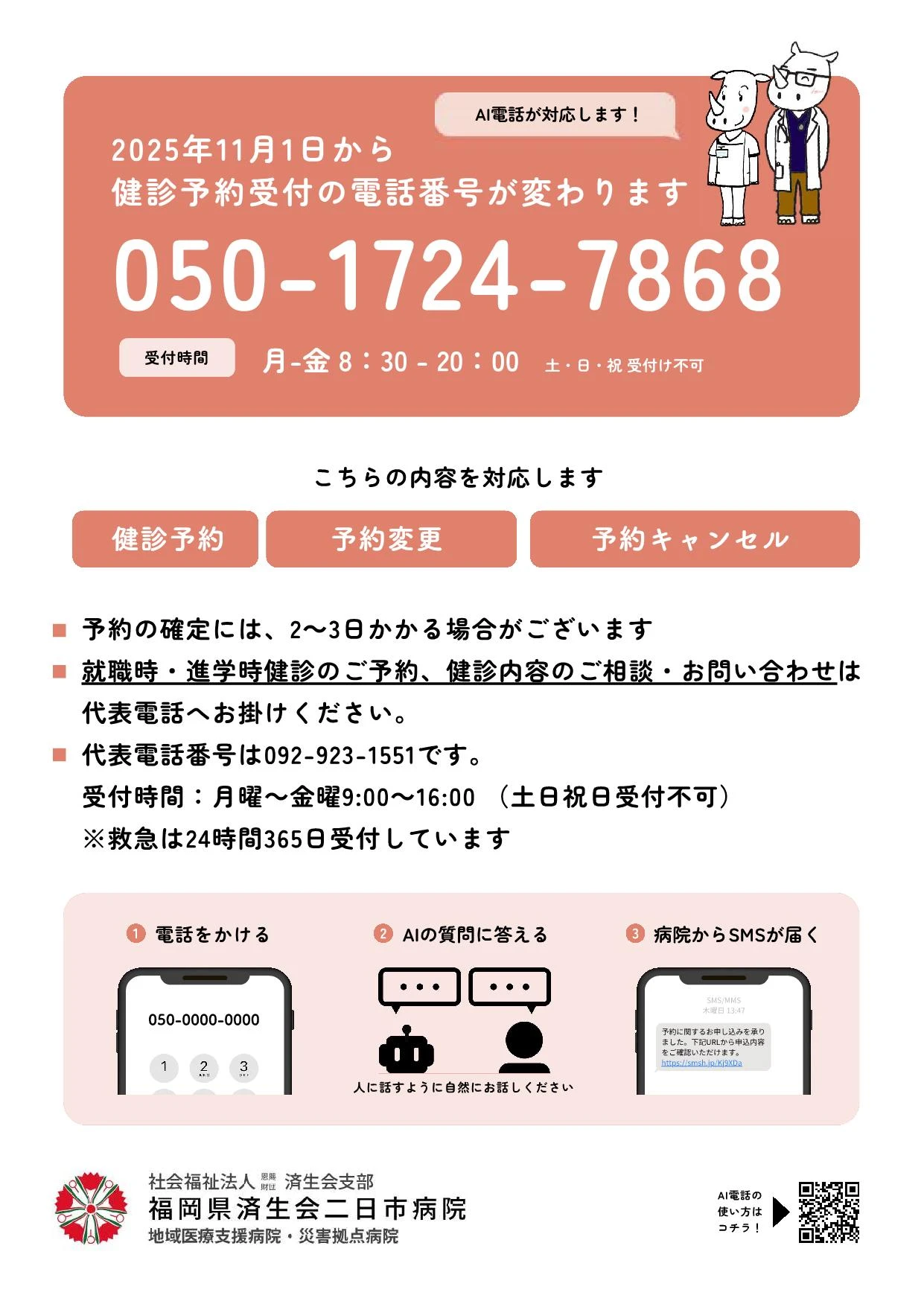 2025/11/1~ 健康診断予約 電話番号変更のお知らせ